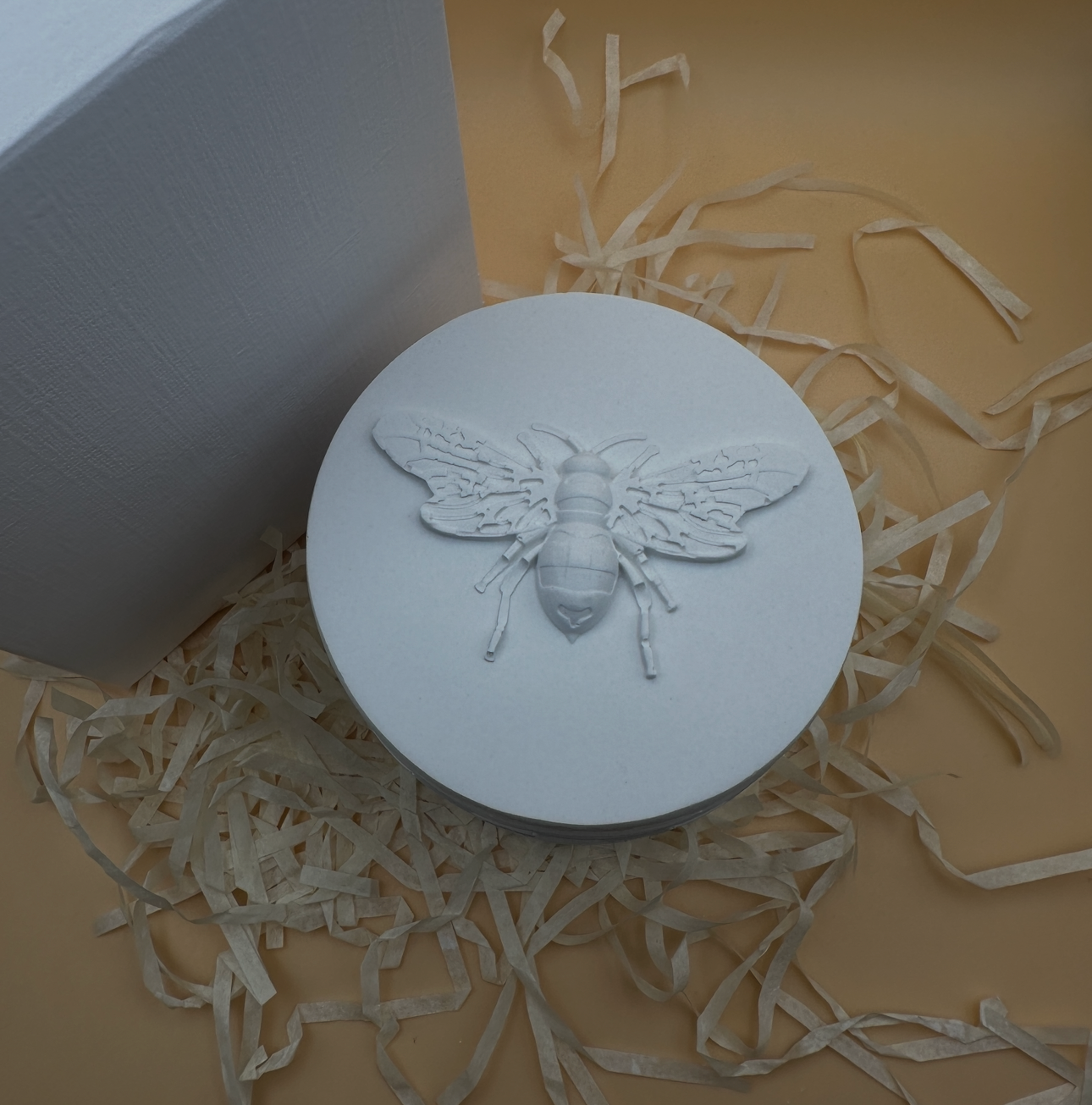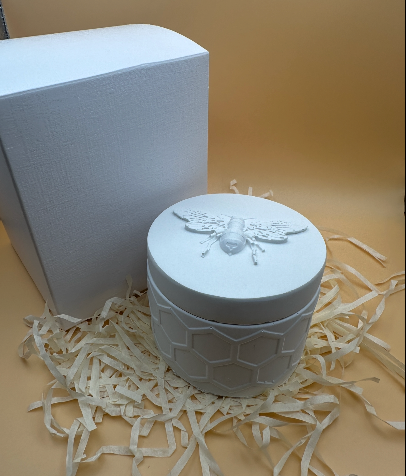 Elegante vasetto con texture a nido d’ape e dettaglio ape in rilievo sul coperchio.