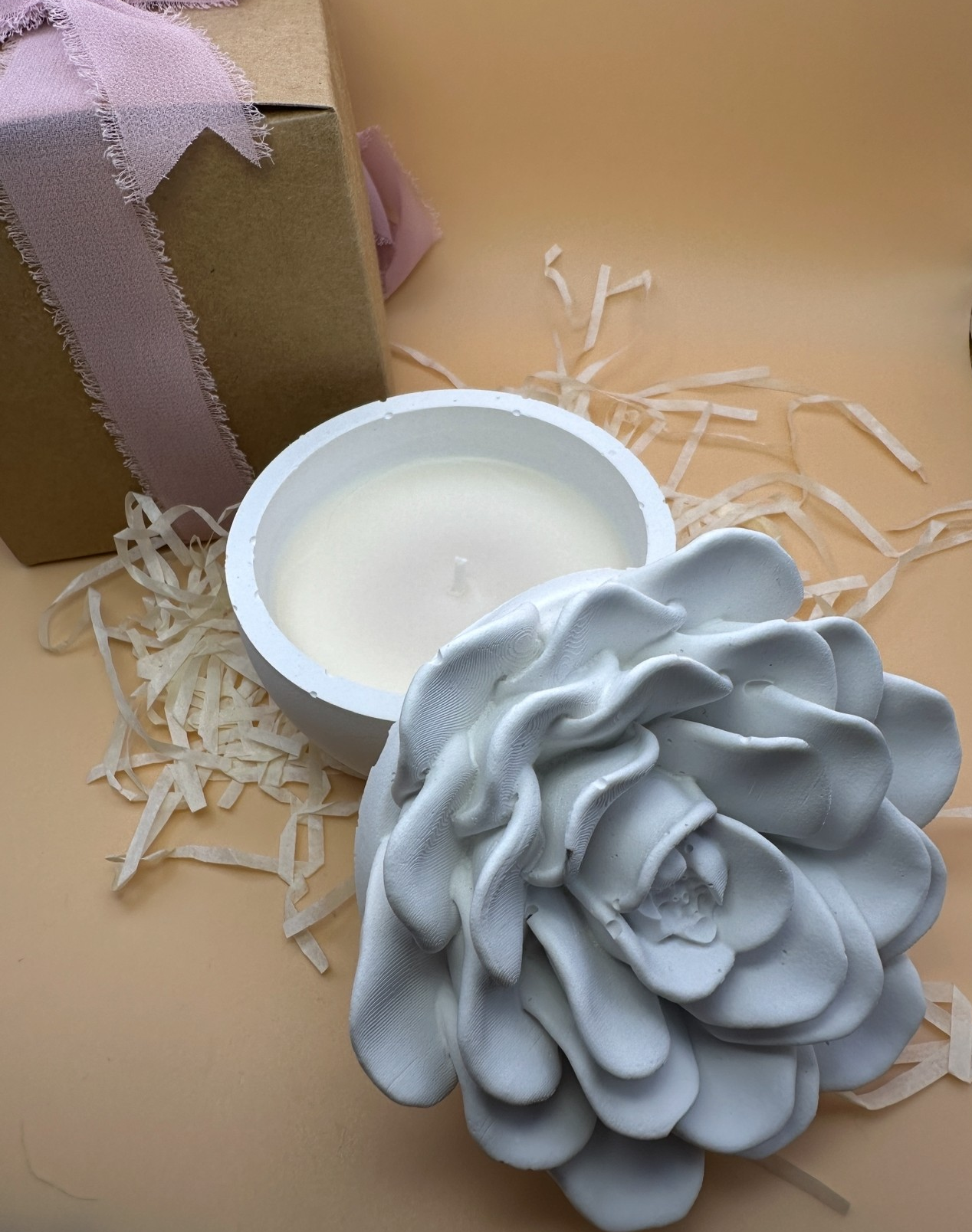 Candela artigianale in contenitore con coperchio a forma di camelia, elegante e scenografica.